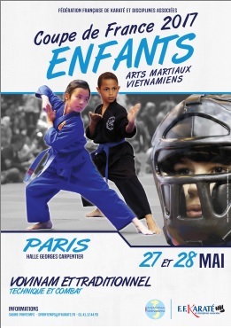 Les Coupes de France TECHNIQUE et COMBAT Enfants (Mini-poussins / Poussins / Pupilles / Benjamins / Minimes) des Arts Martiaux Vietnamiens Traditionnels se dérouleront les Samedi 27et Dimanche 28 Mai 2017 prochains.
