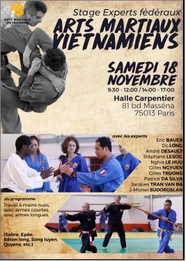 Nous avons le plaisir de vous informer que la fédération organise un stage des Experts des Arts Martiaux Vietnamiens qui se déroulera le 18 novembre 2017 à la halle Carpentier Paris 75013.