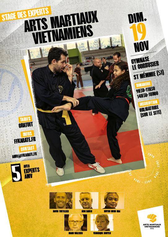 Nous avons le plaisir de vous informer qu'un stage national des võ sư Arts Martiaux Vietnamiens aura lieu le 19 novembre 2023 au gymnase le Corbusier, 2 avenue le Corbusier 51470 Saint Memmie.