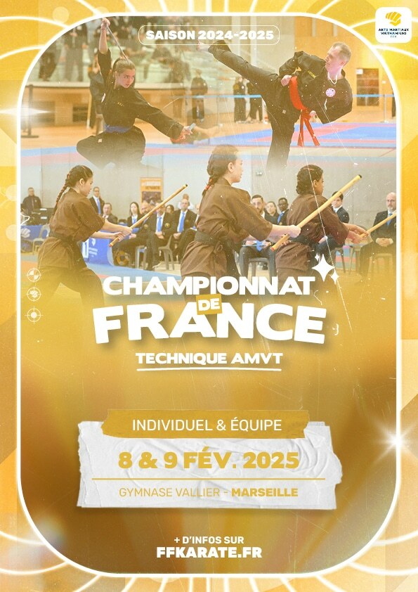 Informations complémentaires Cette compétition est organisée selon le règlement technique des Arts Martiaux Vietnamiens Traditionnels. La présentation du passeport sportif (contenant l’autorisation parentale signée pour les mineurs) et de la carte nationale d’identité est obligatoire. *Inscriptions : Les compétiteurs doivent être licenciés au plus tard 3 jours avant la date limite d'inscription. L’inscription n’est validée que lorsque le droit d’engagement a été réglé. Inscription en ligne. Aucune inscription sur place. Rappel pour les équipes : le nombre d’équipe par club n’est pas limité (mixité possible) en Song Luyen comme en Quyen Dong Dien (Synchro). Un compétiteur ne peut être membre que d’une seule équipe par épreuve. Les membres d’une équipe devront se présenter pour le contrôle et le pointage aux heures précisées ci-dessus. Les responsables de club doivent inscrire leur(s) équipes en ligne et communiquer les noms/prénoms/n°de licence des membres de chaque équipe à amv@ffkarate.fr.