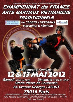 Les finales du Championnat de France ‘TECHNIQUE’ et ‘COMBAT’ des Arts Martiaux Vietnamiens Traditionnels se dérouleront : Samedi 12 & Dimanche 13 Mai 2012 Stade Pierre de Coubertin 84 avenue Georges Lafont – 75016 PARIS Début des épreuves le Samedi 12 Mai, à 11h00 Début des épreuves le Dimanche 13 Mai, à 9h30